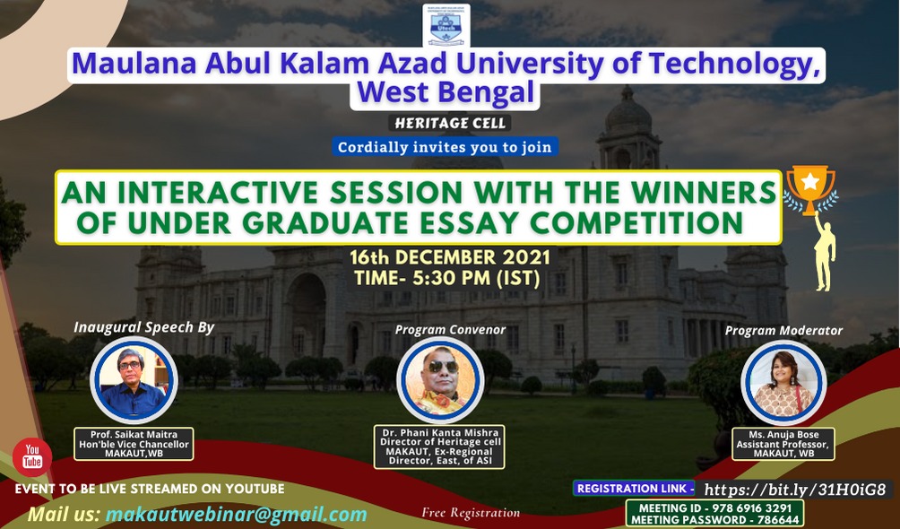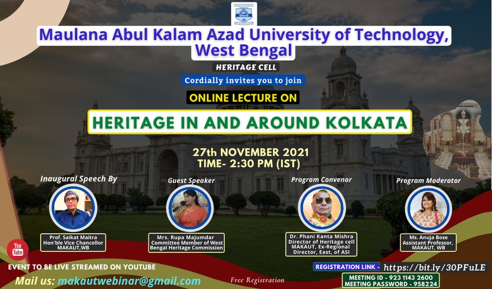 Maulana Abul Kalam Azad University of Technology (MAKAUT), WB, always yearns for excellence. Thus, in Heritage Cell, we wish to bring the tangible and intangible heritage of Bengal under the much needed scholarly attention through our courses on heritage, blogs and other academic events. The Heritage of Bengal comprises of features belonging to the culture, tradition, and languages of a particular society, as well as monuments and sites that were created in the past and still have historical importance. Thus, the Heritage Cell of MAKAUT aims to bring technical aspects of heritage studies like chemical conservation, and structural conservation along with theoretical aspects under one academic department.